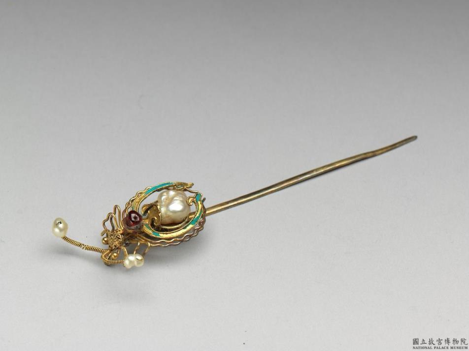 银镀金素挺簪一支,器身细长,簪首为蜘蛛形。头部累丝,金线做八脚,腹部与头部之间嵌红宝石一块,腹部以点翠如意为外框、内嵌二等饭块正珠一颗,头部二触须之末端各嵌小正珠一颗。造型精致可爱。与故杂4932为一对。
