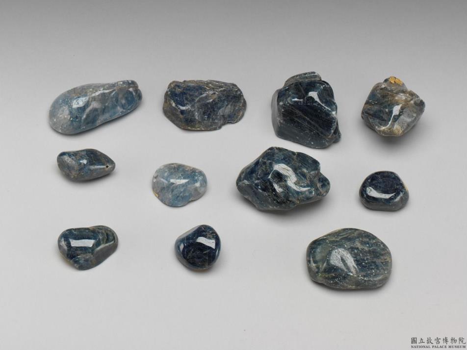 不规则形蓝宝石一块,呈蓝色,可见内部天然结晶纹理。故杂4983至故杂4993以上拾壹块装成壹包。本批蓝宝石由原石切割成大小不一块状,多已打磨光滑,留待制作用品或饰物。