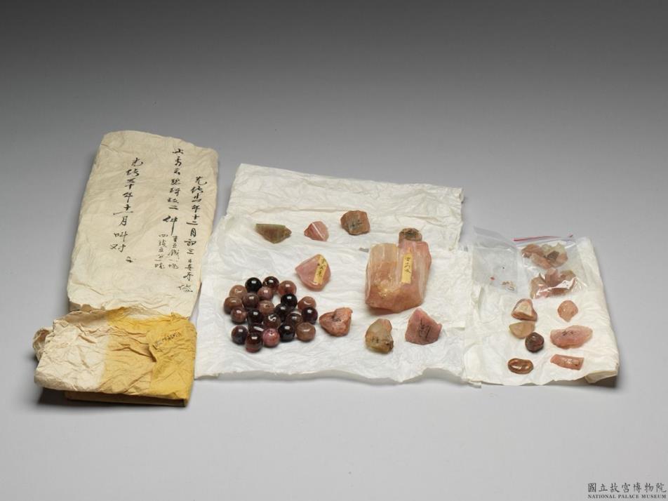 碧玺一块。故杂5023至故杂5091以上陆拾玖块装成一包,整体数量甚多,大小不一,色泽呈粉红色到紫色不等,可见内部天然结晶纹理。表面略经打磨,部分已雕琢成珠球或卵形,留待制作用品或饰物。