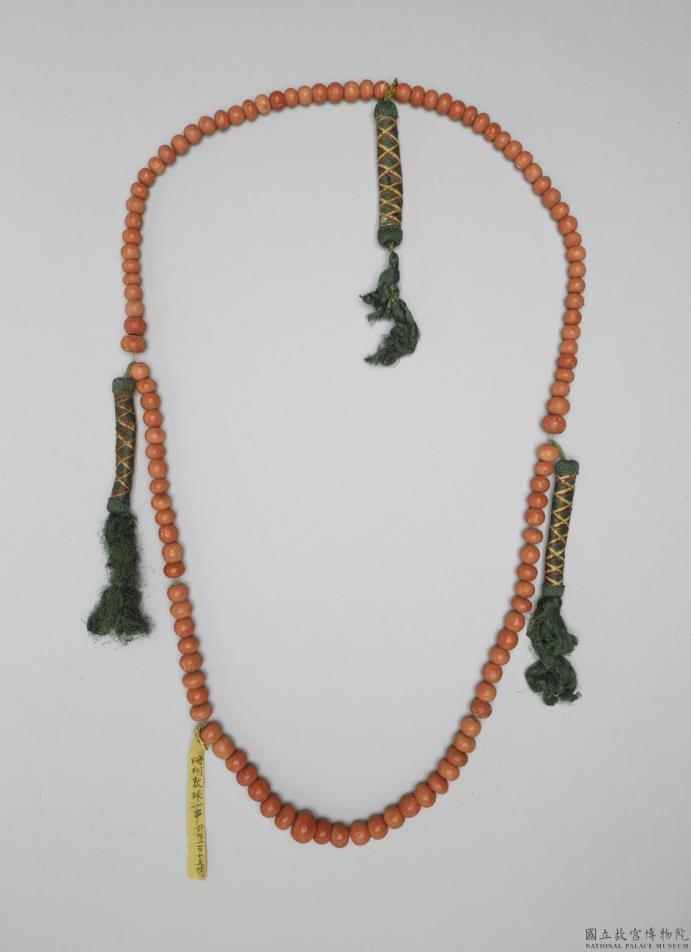 珊瑚数珠一串,一百一十五颗,以黄绦带穿系之。记捻三处,以绿丝线缠绕成管状,并有黄、红、金线编成格纹装饰之。数珠,佛教徒的祈祷用珠,一般以一百零八颗为正轨,并分四段系有佛头、佛头塔、记捻等,以方便记数。无定数的数珠,或可能是服饰的用物。