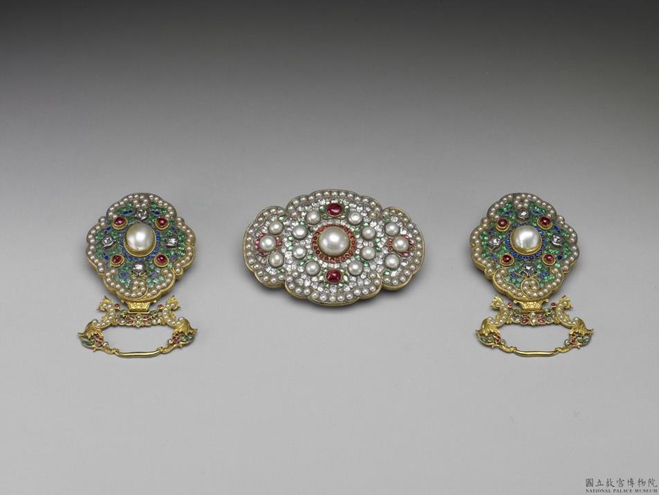 此件含有一带头与二带版。带头略呈椭圆,四边各为一云头形,器表满饰珍珠、红色料石及透明玻璃。带版略呈菱形,镶嵌珍珠、红、绿料石及近代切面钻石的嵌件,下附挂环,均嵌饰珍珠、蓝宝石及红、绿宝石。