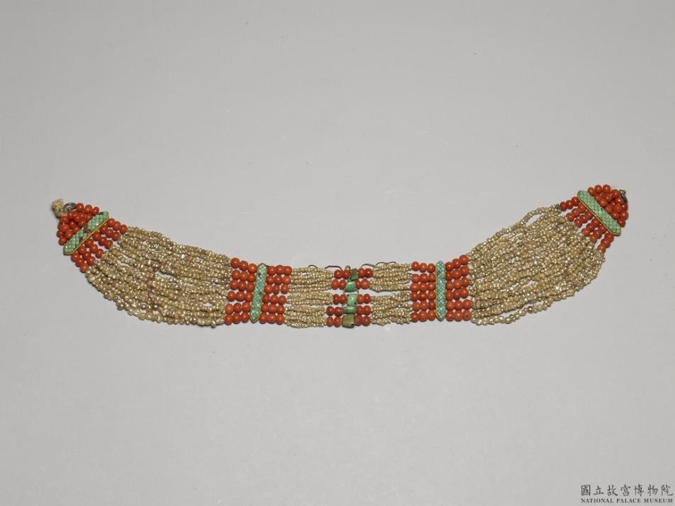 乾隆五十八年四月十一日西藏作品。藏人喜好在衣装上缀饰珠宝,尤其在节庆时,不分男女,皆在衣着发饰上披戴大串各色珠串,相钩搭垂挂,十分华丽。此件两端有银珠环及嵌松石之钩扣,连缀以米珠串及珊瑚、青金石。