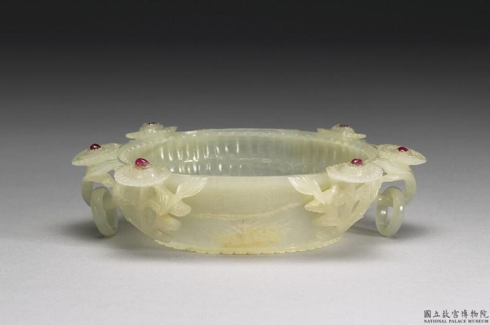 玉洗的质地为闪玉,外形方中带圆,四角及左、右两侧饰镂空花一朵,器外壁浅浮朵花纹,外底则装饰着层层开展、井然排序的花瓣纹,一如盛开的菊花,而底心琢「乾隆御玩」款。 这件玉器的特色,约略可以归纳为:一.大量花叶纹的运用;二.朵花的花心内嵌有红色料石;三.器壁极薄,薄到单面的纹样、款识在另一面清晰可见;而所以称为特点,是因为和中国传统玉器的风格大不相同,反而是较为近似「痕都斯坦」玉器。乾隆皇帝认为「痕都斯坦」玉器「制绝精巧」,苏州玉工是略逊一筹的,所谓「苏州专诸巷多玉工,然不如和阗美玉痕都斯坦玉工所制者,彼盖水磨所造,花叶分明,抚之却无痕迹」、「痕都斯坦玉杯一,…莹薄如纸,惟彼中匠能之,内地玉工谢弗及也」。而在帝王如此明确的表达其品鉴结果之下,中土的玉工也就尝试的去学习「痕都斯坦」玉器「叶簇见重层,刀斧浑无迹」、「抚外影瞻内,花擎叶反披」等特点。这件玉菊花洗就是此一新尝试下的成品。然有其他看法认为或为印度制作。