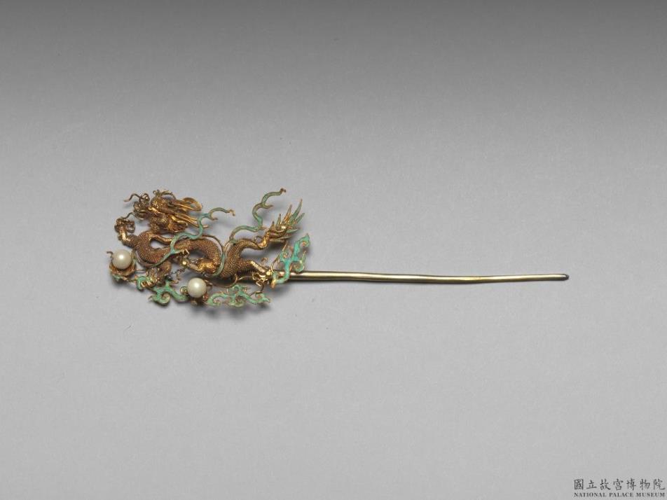 金累丝制成五爪蟠龙,爪下嵌珍珠两颗,龙飞翔于点翠流云纹上,精巧生动,银铤上有戳印「敦华」。