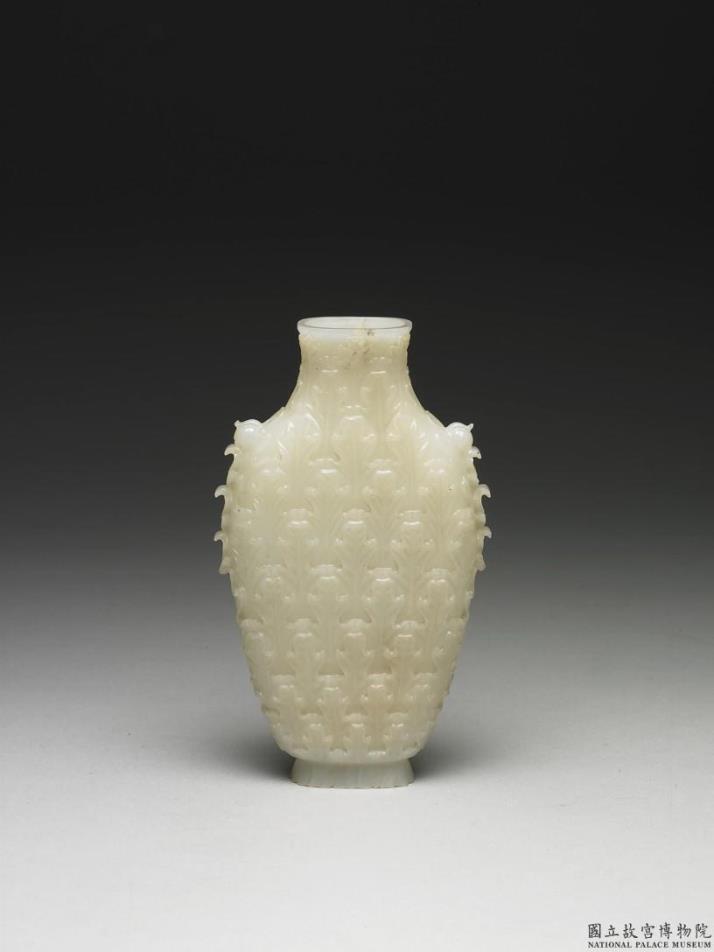 玉质,瓶,小口,短颈,直腹敛下,有足。器身外壁浮雕重复规律之莨苕叶纹,莨苕叶纹为伊斯兰玉器的装饰特色。