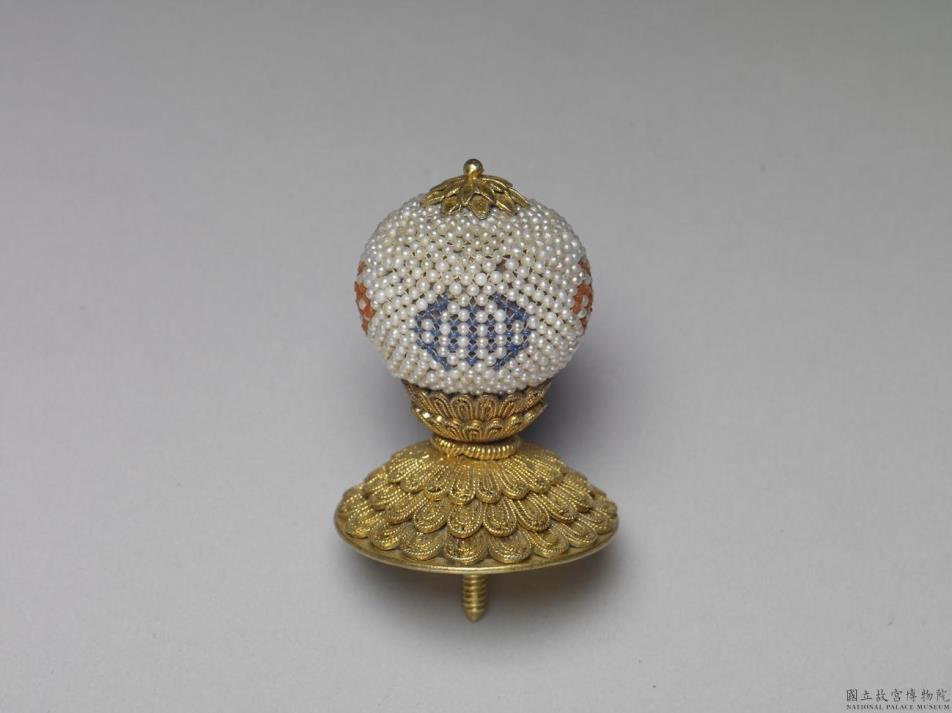 银镀金起花座,上嵌缉米珠圆球,圆球以白色米珠为地,间以珊瑚米珠砌成卍字、蝙蝠纹,又以蓝色米珠缉成寿字。