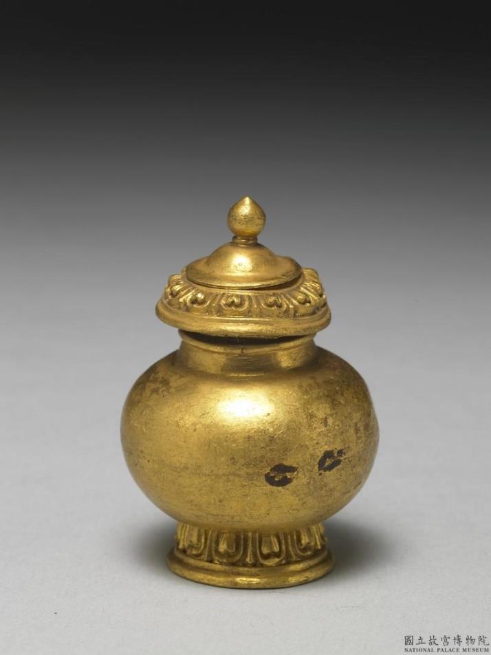 小圆口,翻领向外敞披,短颈,圆腹,短胫,凹足,带圆钮圆顶盖,领缘及胫外铸饰莲瓣纹。院藏同样的小金瓶共107件(故杂6601~故杂6707),这些作品于清末,原皆藏于一木箱中。按照该箱内贮其他文物的性质推断,这些金瓶可能用于佛教祭祀中。