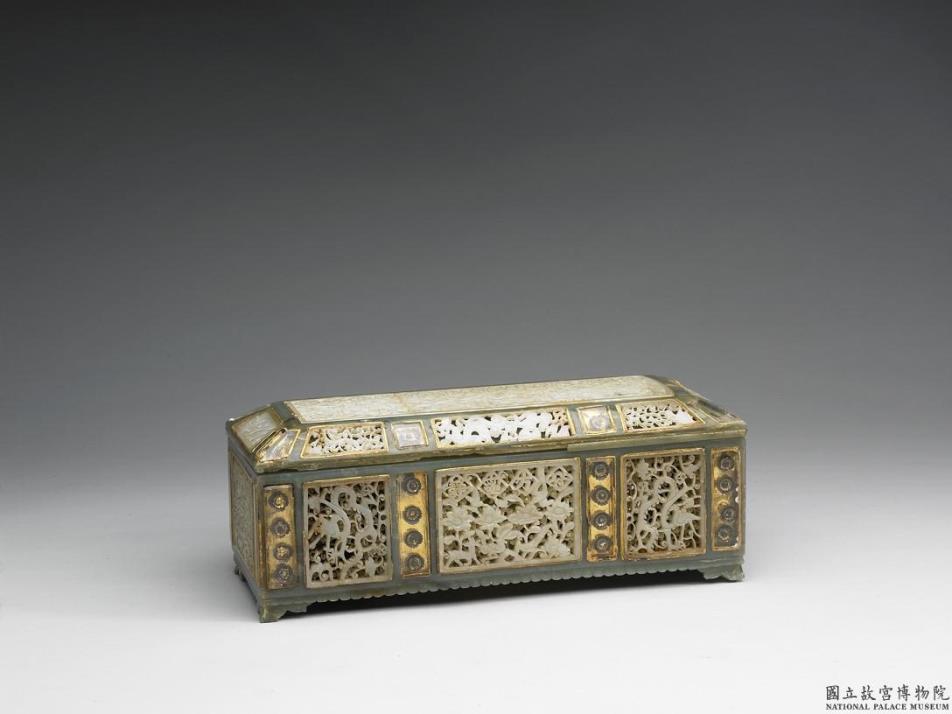 长方匣以多片青绿玉与明代白玉带版组合而成,平底,带四足,梯形盖。玉带版镂雕龙纹、鸟禽、花叶纹,有些更镂雕一组组吉祥语。盖顶以两片玉带版拼接。右边玉片上镂雕的字,自右至左轮替向中央读为:「风调雨顺万万寿」、左方一片镂雕「万方如意」;盒身四面中央玉片分别镂雕「四夷来贺」、「八方宁静」、「吉祥如意」、「永世长春」等字。除了带版外,匣与盖身各面嵌多块玻璃,玻璃下方装饰金属制花朵。匣内一端分作三格,上面分别加装圆形玉盖,或可用来盛贮墨水。附珊瑚水勺一支。据《活计档》推断,本器入宫时最初被称为「痕都斯坦墨壶笔室」,乾隆五十七年(1792)皇帝又回想起往事,因而另作器底所见之御制诗〈咏赛提卜阿勒第所贡和阗玉笔砚匣〉:「巧琢和阗玉,四藏宛具中。虽非贵异物,实乃表丹衷。镌字颇相似,非书却不通。鉴诚与笑纳,亦以畅文风。乾隆壬子春御题。(下接二钤印)八征耄念。自强不息。」本器为中亚作品。