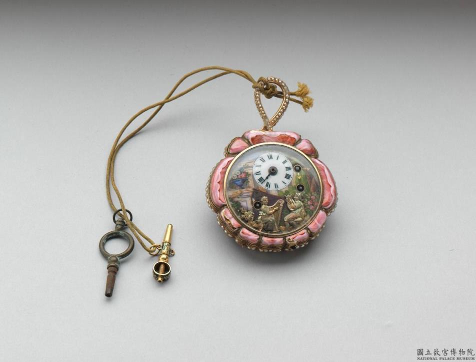 花式怀表一对(故杂7128、故杂7129),套环、表壳周边镶饰珍珠。表壳绘饰画珐琅玫瑰花叶,表盘背景绘庭园建筑与花木树石,嵌饰西洋奏乐人物,属十八世纪晚期至十九世纪上半叶,陆续进入中国市场的花式造型珠表类型。