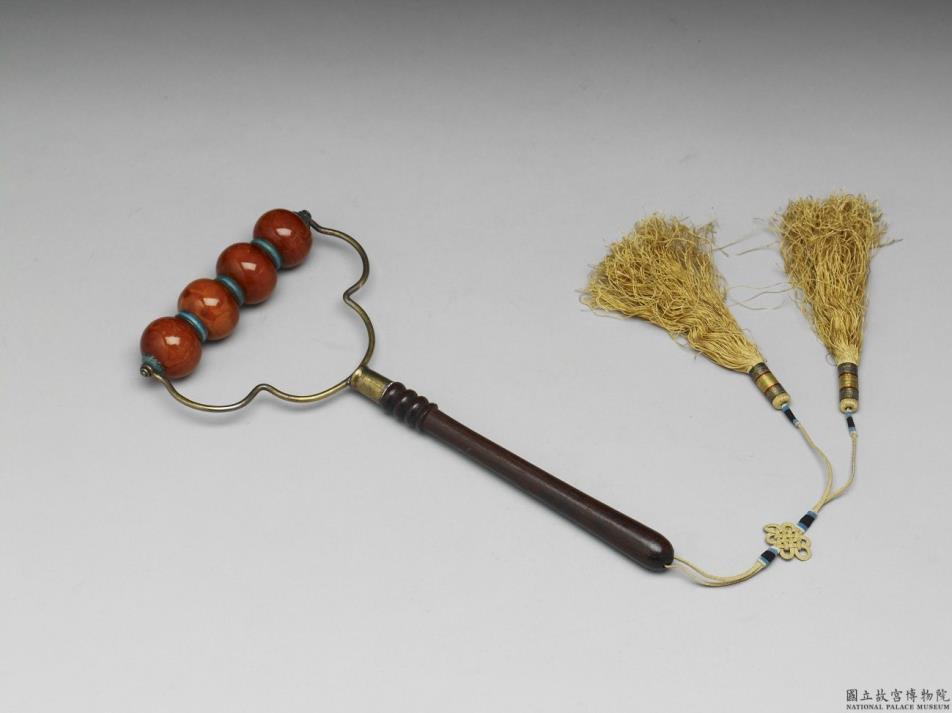 木柄,柄前端接金属架,尾端串盘长绳结,垂双流苏。金属架固定四颗扁圆形红色蜜腊珠,可以来回滚动。滚子为按摩器具,清代称之为太平车。
