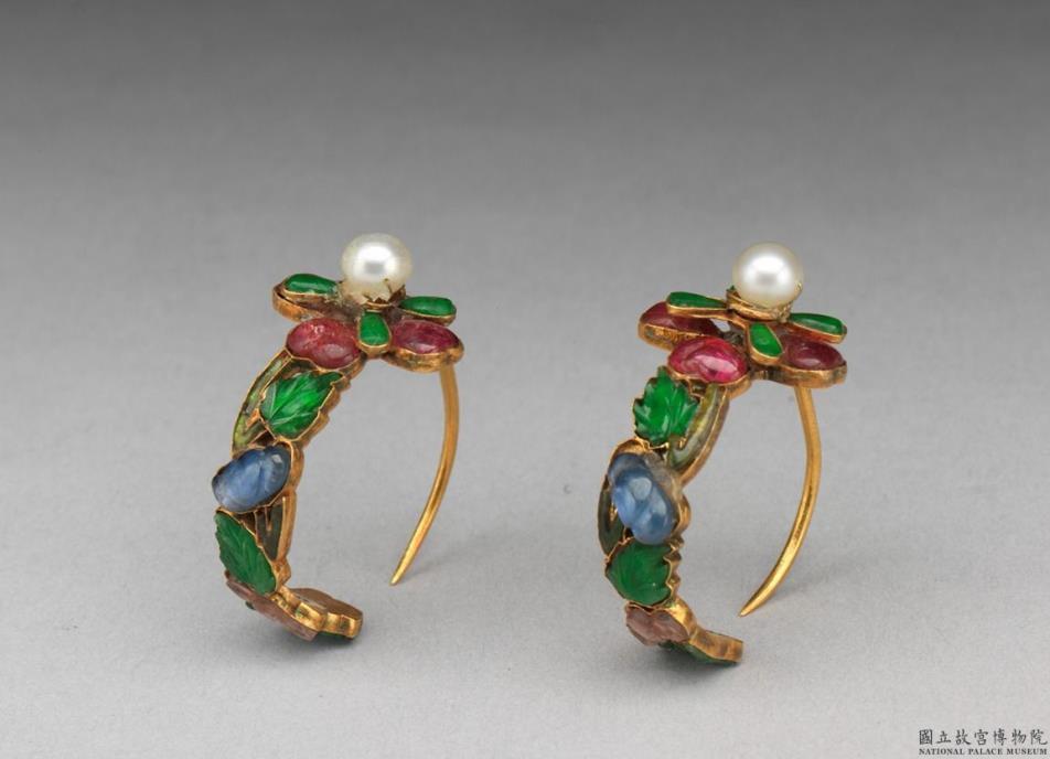 耳饰大致分成两类,凡有珠宝悬坠者称耳坠,其他的都称耳环,满清妇女将穿孔耳环称为「钳」。按旗人旧俗妇人一耳穿三孔戴三耳坠,入关后渐同汉俗。此耳环以红色宝石、绿料和珍珠组成葵花一朵为主要装饰,下半环仍镶蓝色宝石、翠玉和粉红碧玺组成花叶陪衬。