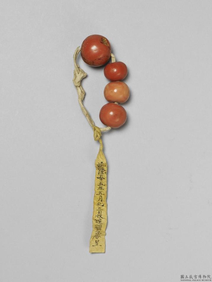 大珊瑚珠一,色呈亮橘。故杂7701~7704皆为珊瑚珠,大小不均,四粒为一串。