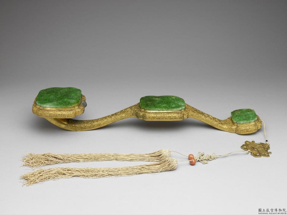 通体皆加纹饰。正面柄端镌刻佛、道家八宝,以柄中央为中心,上截刻:「轮、螺、伞、盖、盘长、鱼、瓶、花」八宝;下截镌八仙手持标志物:「莲花、芭蕉扇、笏板、葫芦、宝剑、渔鼓、笛、花篮」。余皆为蟠枝花卉,三镶翠玉皆浅雕云龙纹,背面刻缠枝番莲纹。下垂「福庆有余」镀金铜片。下垂土黄编花双穗,附珊瑚珠二粒。