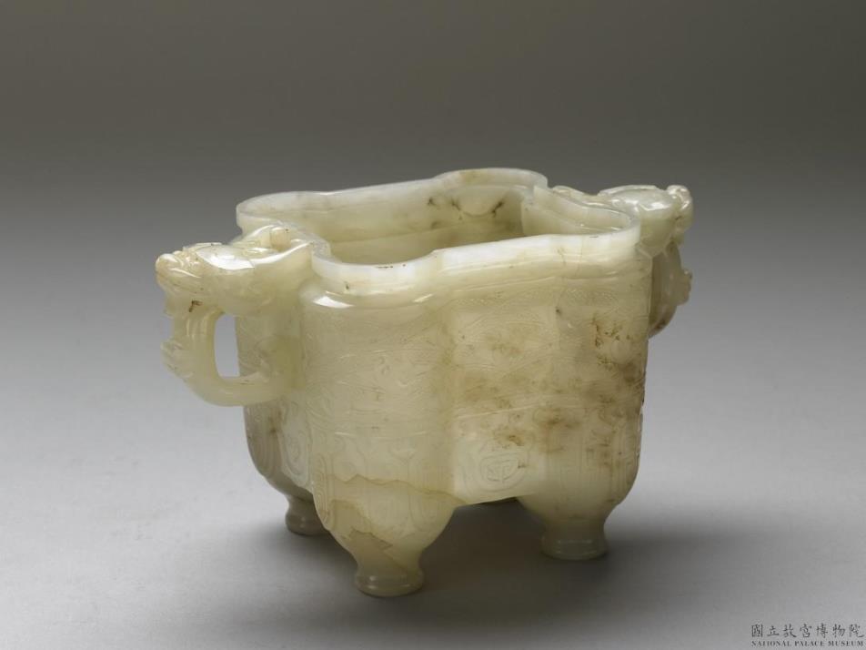 玉质,带灰白及褐色斑纹。仿古器型,器呈方形体,双耳,四柱形体足,底足收敛。体为联结的四柱方形状,上雕饰交缠龙凤纹及兽面纹;两耳镂雕龙首。