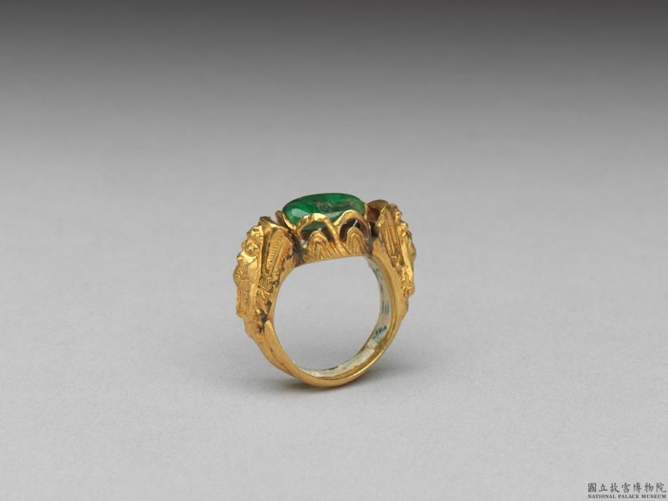 戒面嵌翠玉,座饰云山纹,两侧各饰浮雕龙首纹,龙身饰乳丁纹。