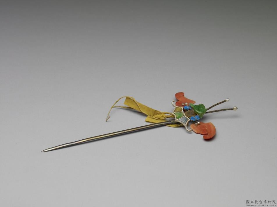 单股绾发簪,蝙蝠形。簪首以银鎏金座,上嵌浅浮雕翠玉蝙蝠首,饰涡纹耳,作张口状,累丝触须末端各缀饰一粒珍珠。蝙腹部嵌珠脱落,鼓翼以珊瑚浅浮雕成棱瓣开展状,腹与翼间各饰如意云点翠及小珍珠二,以绿色丝线串系。尾部缉米珠做僧帽状三开光,内各嵌饰蓝、绿、黄色碧玺。鎏金素铤,末端脱色,背有凸模锤鍱阳文款「宝华」、「足银」四字。本件形制同院藏故杂8592,均以蝙蝠为主题,寓意迎祥接福。附黄签两张,各书「一百六十七号」、「四百五号」。