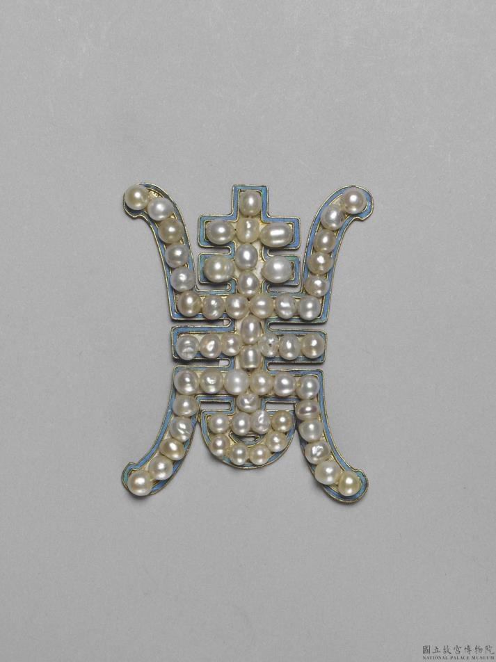 金属片状饰,即将金属锤鍱为对称状的「寿」字,「寿」字上再缀饰珍珠而成。「寿」字边廓点翠亮眼,珍珠或圆滚、或如卵石状,或白或泛黄,粒粒皆光泽饱满,再加上金属的镀金所呈现的金黄色富贵之气,共同显示出器物的华丽与价值非凡。