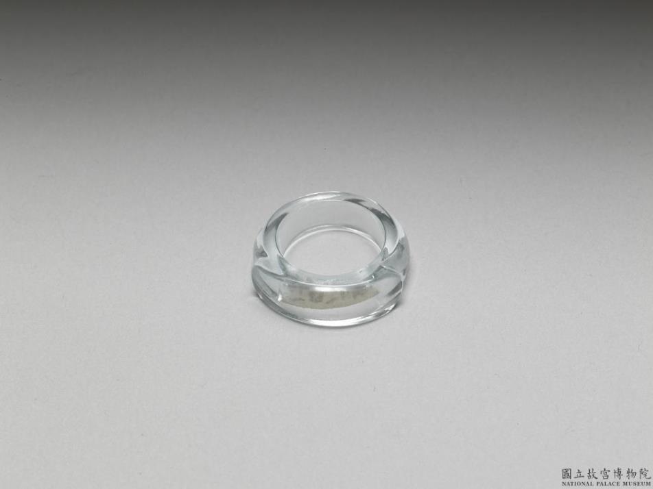 水晶戒作马鞍式,戒面呈长弧形,略突出戒环之外。透明光素无纹。