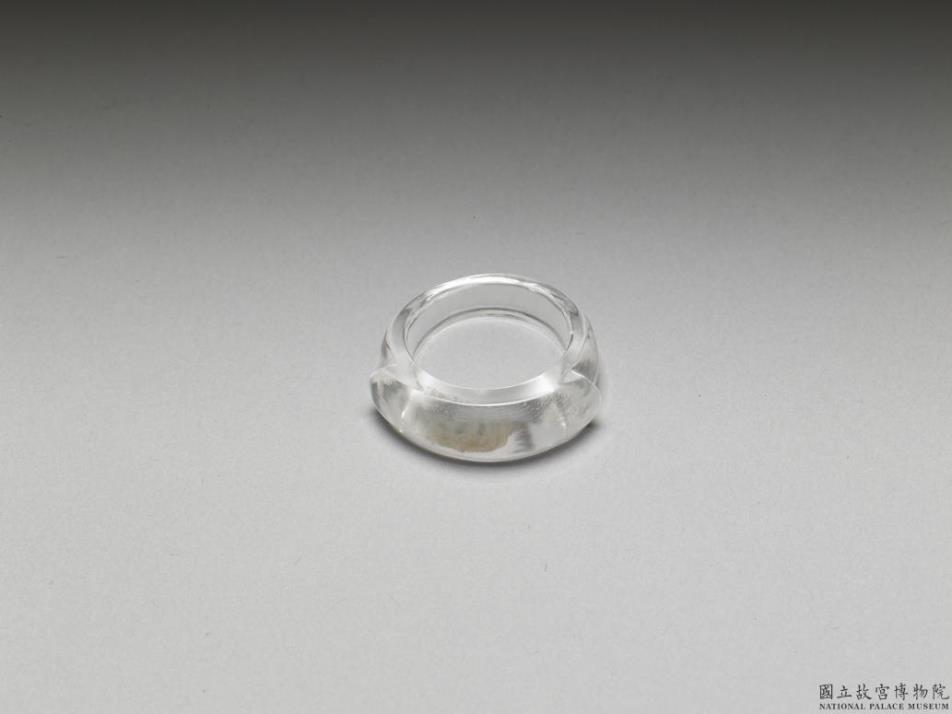 水晶戒作马鞍式,戒面呈长弧形,略突出戒环之外。透明光素无纹。