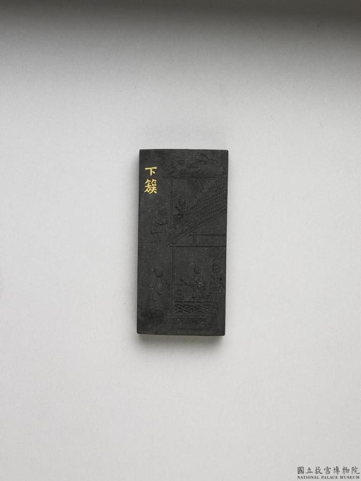 长方形墨。一面模印填金楷字「下簇」,并模印屋舍庭树,画面共有五人,就中四人两两相对晤谈,殆正讨论贸易,一人捧量蚕茧于后。另一面漱金题:「御诗。献茧由来重女功,绘图今见列璇宫,圣人不为丹青玩,玉榖珠丝此意同。」御制织图诗墨一套二十三件,收于双龙「御制耕织图诗墨」漆提盒,并有锦盒与函套。
