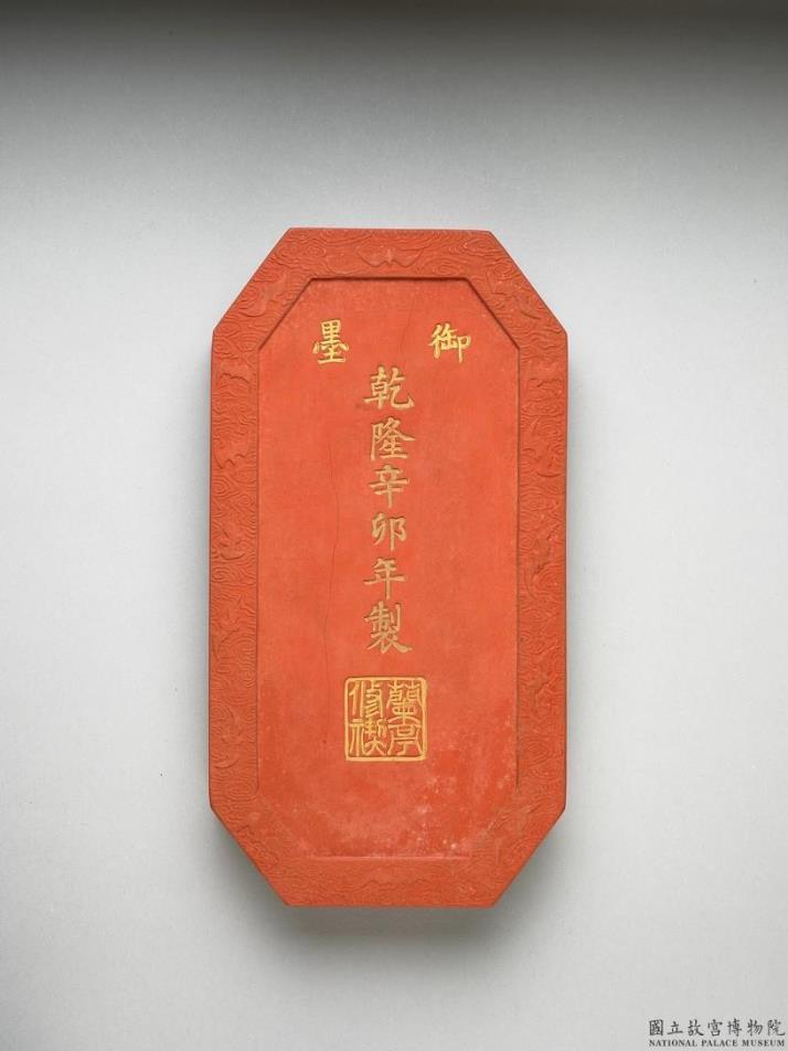长方形朱墨,四角截去而呈八角形,边框起棱,棱面模印云纹与蝙蝠纹。一面填金楷字「御墨」、「乾隆辛卯年制」(1771)款识,并模钤填金「兰亭修禊」四字。一面模印兰亭修禊图像,人物众多,三三两两,聚坐于流水旁,或相对讨论,或张纸执笔,或正勾取水中之流觞,正是王羲之《兰亭集序》一文所描写的图像。
