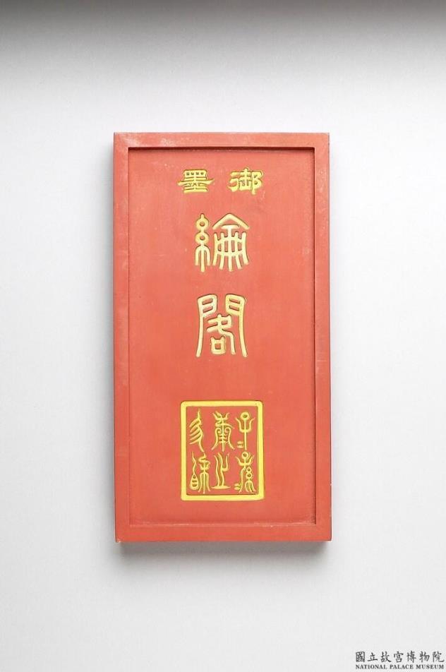 长方形朱墨,边框起棱。一面模印填金「御墨」隶字与「纶阁」篆字,并模钤「子子孙孙用之协相」。一面则为台阁楼景,建筑内可见桌案,案上有书册多迭,由于「纶阁」是天子纶旨制诰的起案处,故此面图式应该是表现「纶阁」者。墨侧有「乾隆丙申年制」(1776)楷款。此墨与其他三十五墨同储于一锦屉。