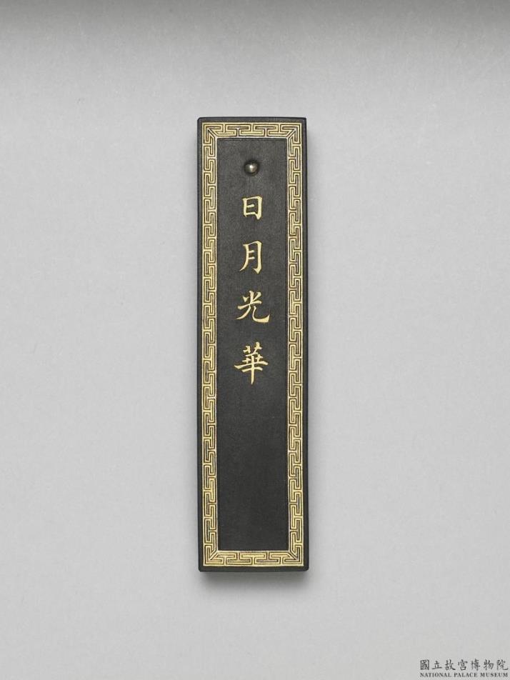 长方形墨,周起细棱,色黝黑细腻。一面模印漱金回纹方框,面上方镶嵌一小珍珠,下楷书「日月光华」四金字,另一面布满漱金云纹。本墨一式八件,共置于金漆龙纹长方盒中,漆盒并以绫布方袋盛装。
