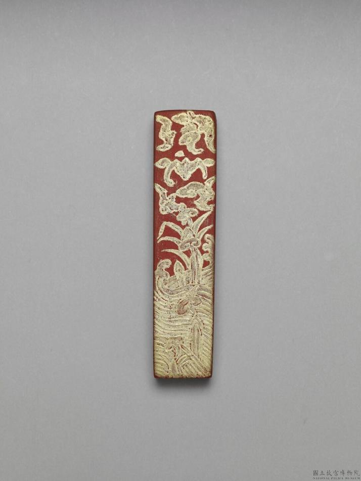 长方形朱墨,墨面纹饰漱金。其一面模印海水波涛,间有小岛如福山寿海,海面云气上升,中夹一日,墨面最上方正面龙纹。另一面亦见海水波涛与小岛,小岛上生长有芝草,墨面上半部则为五蝠飞舞于云间,皆是吉祥的象征。本墨一式十件,皆附纸盒盛装于一漆屉中,五屉一组,同入一漆提匣。