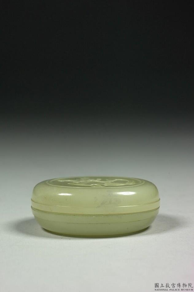青玉扁圆盒,平顶盖、子母口、平底、浅圈足。盖饰浅浮雕回首螭纹。