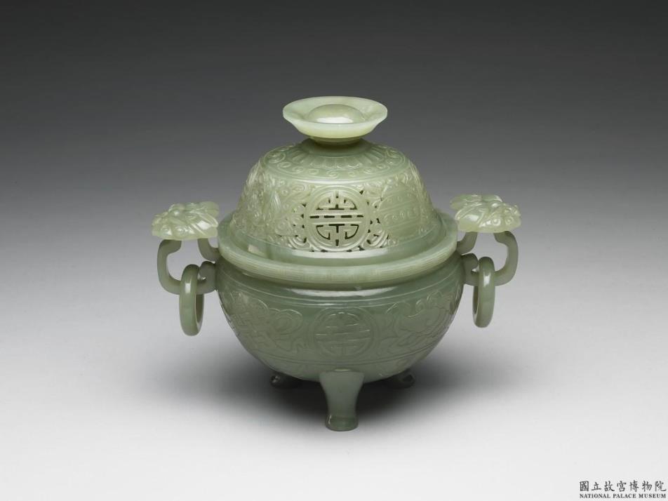 青玉质,略有褐黄斑。圆腹,三兽足,兽面活环耳,带盖。器腹、盖分别以浅浮雕和镂雕技法饰八宝纹及团寿字。器盖圆拱,盖顶琢有菊瓣纹和云纹。炉为香具,与香瓶、香盒三件一组。