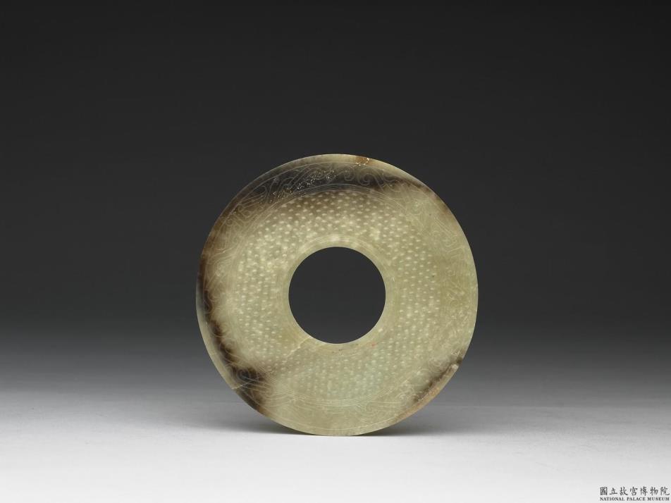 青白玉,由外缘向内,局部有暗褐色沁,半透明。圆整,平廓,廓线圆整;中孔、外缘均齐整;花纹分内、外二区,内区刻饰以蒲纹,外区刻饰以双身动物纹,近内廓有一圈绞丝纹,内、外区间亦有一团绞丝纹。附木架。