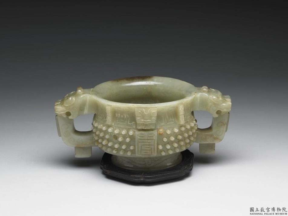 玉质,青灰泛绿色,局部带赭斑。簋形炉,双龙形环耳,下有垂珥。器腹饰高乳丁纹,乳丁是一粒粒圆柱嵌入凹槽而成,偶有乳丁遗失的情况。腹璧棱脊上为兽面、下为「寿」字。无盖,配有木座。为香具,与香瓶、香盒三件一组。