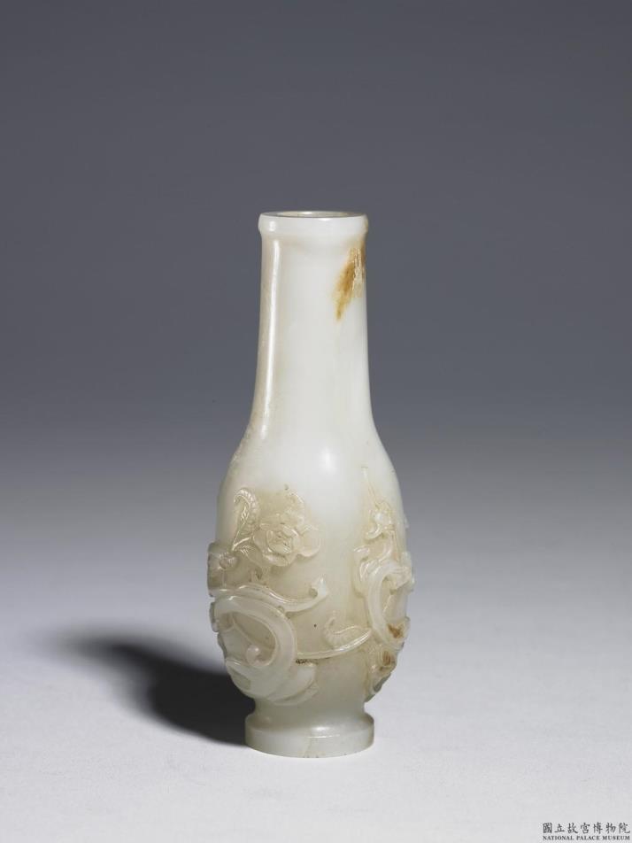 玉质光润,口沿一条赭斑。平口,长颈,圆腹,圈足。腹高浮雕母子螭三只,口衔折枝花卉。雕工工整。附镀金铜箸、铲。铲面为四瓣花海棠形。铜箸,即铜筷,用来从香盒内夹出香块;铜铲,用来铺平炉灰。