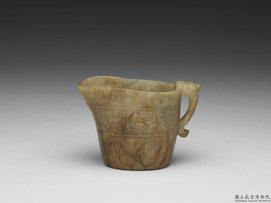 玉质,色青白有大片黄斑及白点。器身呈椭圆形,侈口,深直壁,上敞向下渐收,平底内浅浅去料成为圈足,握把上雕线条简单之兽首,另一侧为流。口沿饰一圈回纹,外腹以二道粗弦纹分隔,分浅浮雕云纹及变形花叶纹。杯底阴刻「永保」二字篆款。