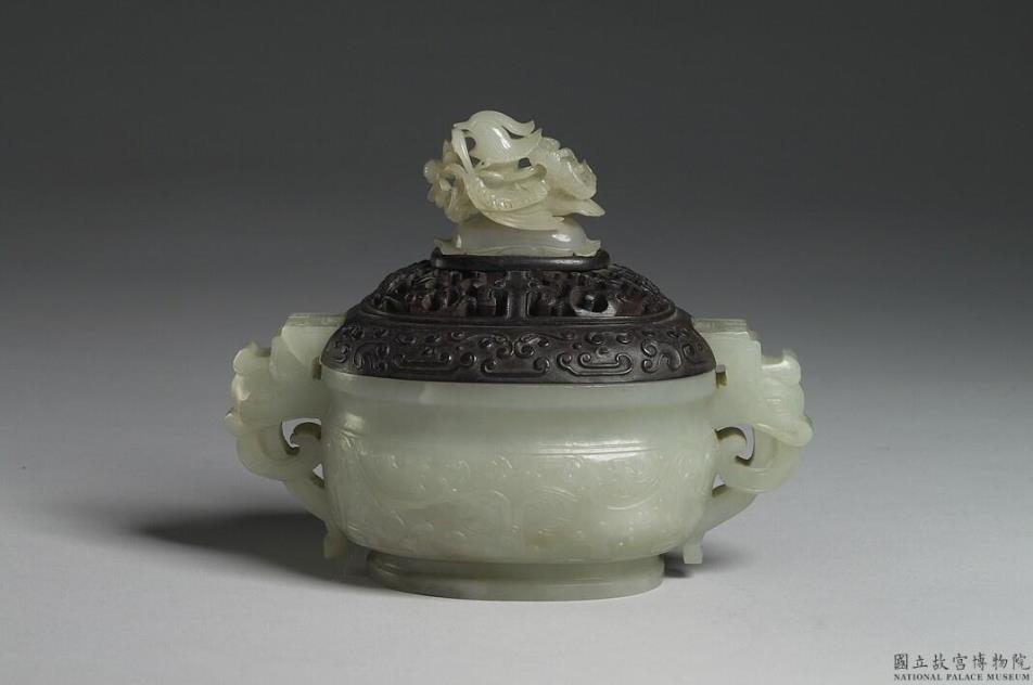 青白玉簋形炉,兽首形耳,有圈足。附木盖玉顶,玉顶年代为元代。腹饰有浅浮雕兽面纹。
