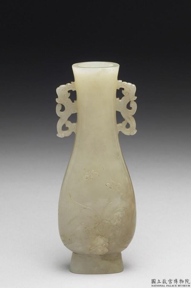 玉质,色青灰,有白色斑纹与璺。直口微撇,长颈,深腹,圈足,镂雕龙兽为双耳。器身扁圆,器腹浅浮雕山石上兰花草二株,上有蝴蝶飞舞。瓶是用来放置筷及铲,与炉、盒三件成组。