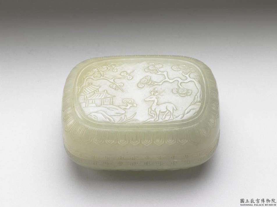 玉质,有瑕纹。椭圆形盒,子母口。盖面长方形开光,内浅雕松、鹿、灵芝等吉祥图案,盖四周则是变形莲瓣纹一周。盒为香具,收纳香品,与香炉、香瓶三件一组。