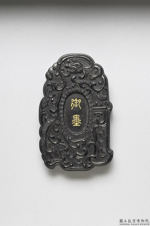 黑墨,外廓为近卵形之不规则状,两面皆模印一龙飞绕于云间,墨面中央有一椭圆形开光,开光中文字两面有异,一面为填金隶字「蟠云」,另面为填金篆字「御墨」。惟除龙首外,龙身纹多变形而与云纹无别,尾部则近蕉叶之形。墨侧有「大清乾隆年制」楷款。此墨与其他九墨同储于一屉。