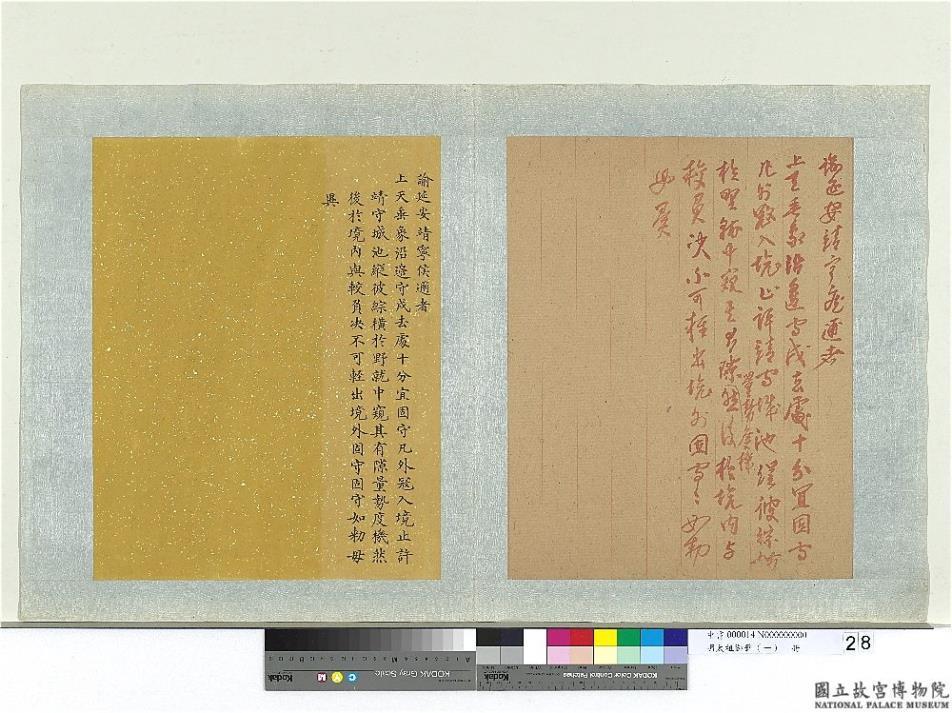 (朱书)谕延安靖宁侯。迩者上天垂象。沿边守戌去处。十分宜固守。凡外寇入境。止许靖守城池。纵彼综横于野。就中窥其有隙。量势度机。然后于境内与较(疑脱胜字)负。决不可轻出境外。固守固守。如勅毋异。