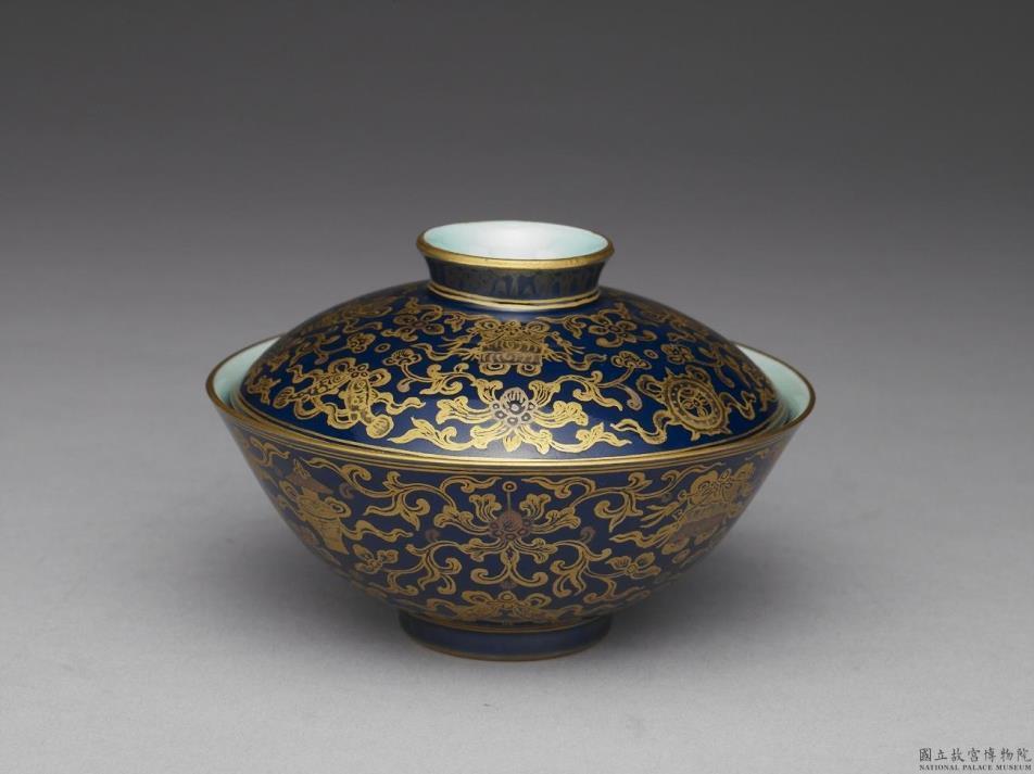 盖碗,敞口,深壁,圈足,带圈足钮笠形盖。外壁施霁青釉,以金彩描绘纹饰,盖面及外壁皆绘佛教八宝,隙地绘番莲花叶纹,盖与碗之口、足缘皆涂金彩,并有两道弦纹;内壁及圈足内皆施湖绿釉,盖钮及圈足外底各以青花书「大清乾隆年制」六字三行篆款。