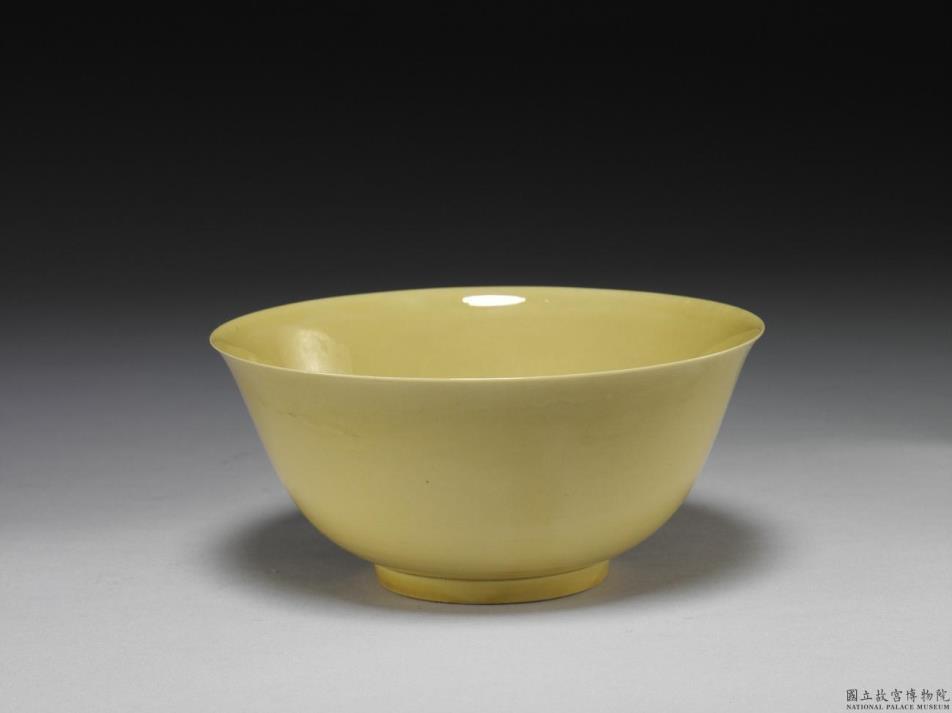 微撇口,深弧壁,矮圈足。全器内外壁均施黄釉,釉色浓艳明亮。外壁施釉至足际,足边修釉齐整。足圈露胎,圈足内底施白釉,并书「大清康熙年制」六字双行双圈青花楷书款。