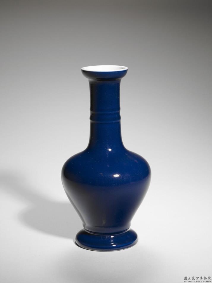 盘口,折沿,直长颈,斜肩,敛腹,外撇圈足。颈饰凸弦纹两道,器内施透明釉,外施霁青釉,釉质光滑润泽。足底缘露胎,胎质细致洁白,底部中心内凹,施透明釉,书青花「大清雍正年制」六字双行楷书款,外围双圈。