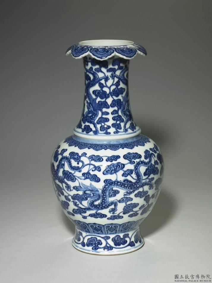 瓷胎,微侈口,花式唇下垂,长颈,圆肩,敛腹,外撇圈足,唇部以贴花方式外加于口沿。以青花图纹为饰,唇部绘云纹,颈部绘两对行龙,肩部饰一圈如意云纹,腹部绘四只行龙,腹部下缘饰一圈莲瓣纹,颈、腹隙地及圈足绘云纹。足缘露胎,呈白色。底白地,书「大清乾隆年制」三行钴蓝篆书款。