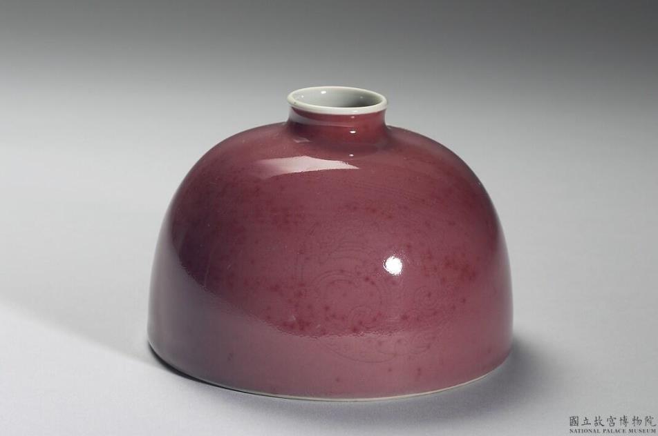 小口微外侈,短颈溜肩,广腹,形似半圆球,平底凹足。器身施铜红釉,因受窑炉温度影响,呈色有深浅之别,类似豇(音同姜)豆色泽,故有豇豆红釉之说。器腹浅划三组暗花团螭纹,口沿及器内施白釉,外底有「大清康熙年制」楷体款识。此类小口半圆穹状的器型一般被称为「太白尊」,然而清宫档案旧称为「花囊」。对照西洋传教士殷弘绪的书简,得知是以吹釉法施釉。