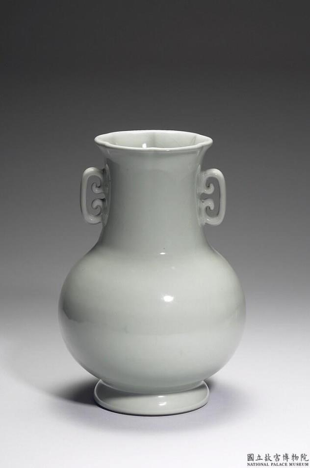 六瓣花形口,口外侈,直颈硕腹,双如意云头形耳,圈足外撇。整器罩施汝釉,色青白而匀净。圈足露胎,涂褐色汁,足内汝釉地「大清乾隆年制」三行六字钴蓝篆款。