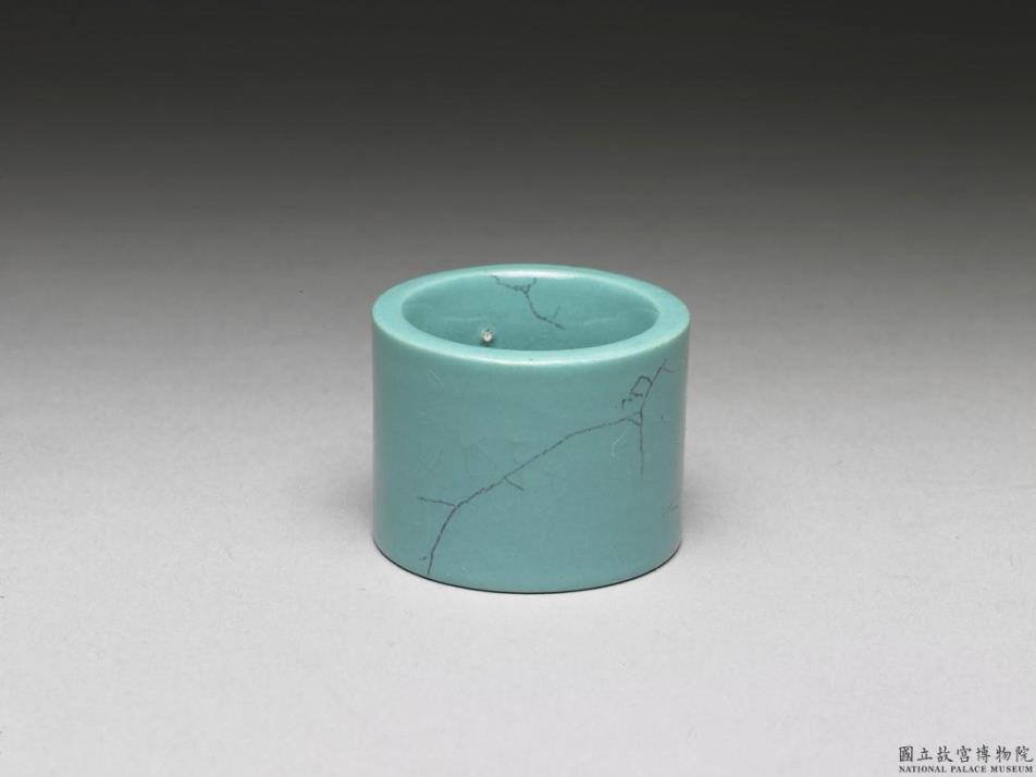 瓷质扳指,短管状,上下口径略异。通体施松石绿釉,并出现仿天然石材的灰黑色条纹。本器一式二十件,共同储装于一木匣中。