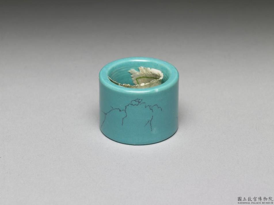 瓷质扳指,短管状,两端口径略异,内壁微见辘轳痕迹。通体施松石绿釉,并呈现仿天然石材的灰黑色斑纹。本器一式二十件,同储于木匣中。