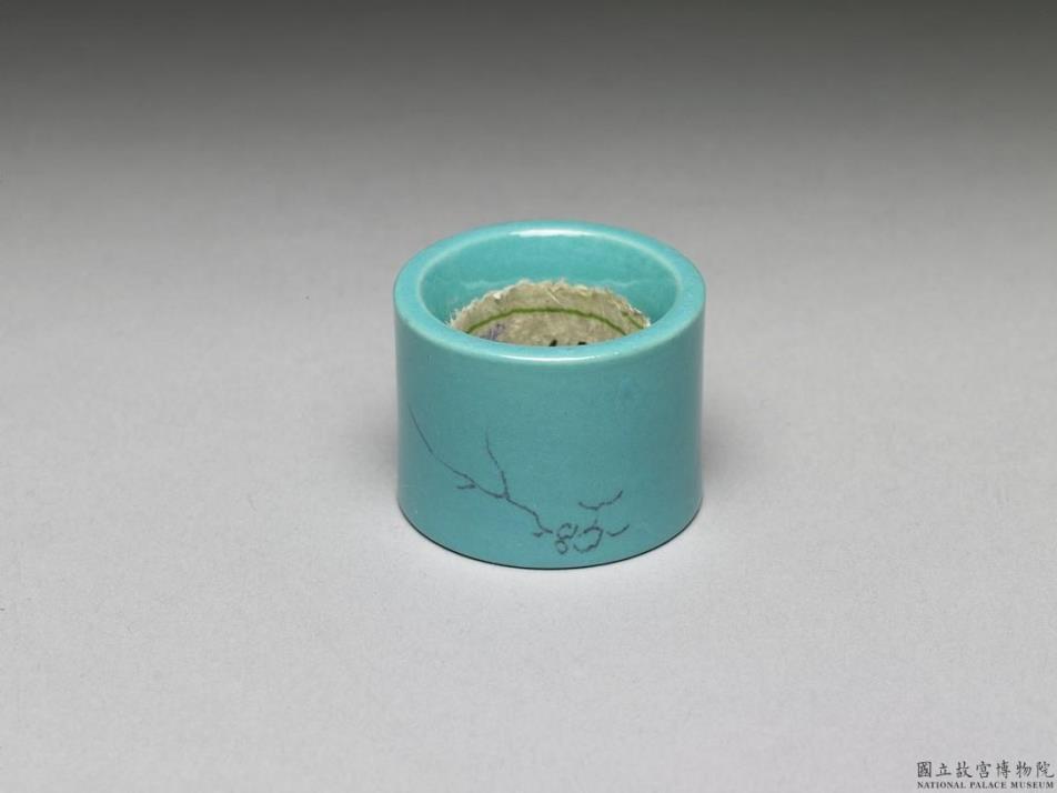 瓷质扳指,短管状,两端口径略异,内壁微见辘轳痕迹。通体施松石绿釉,并呈现仿天然石材的灰黑色斑纹。本器一式二十件,同储于木匣中。