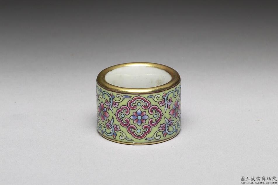 瓷胎,器作管状扳指,两端口径略异,是为方便穿套手指之设计。上下口缘均饰金彩一圈,外壁施黄釉为地,彩绘如意花卉纹。此器一式十件,同储于木匣中。