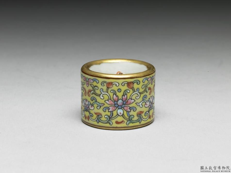瓷胎,器作圆筒状,两端口径略异,是为方便穿套手指之设计。上下口缘均饰金彩一圈,外壁施黄釉为地,绘饰多彩番莲花叶。此器一式二十件,同储于木匣中。
